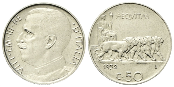 Vittorio Emanuele III, 1900-1943. 50 Centesimi 1932 Roma, Leoni, bordo Rigato.