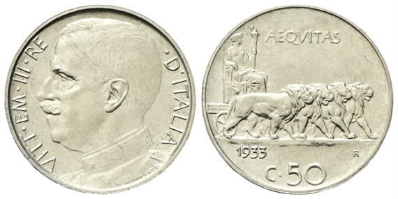 Vittorio Emanuele III, 1900-1943. 50 Centesimi 1933 Roma, Leoni, bordo Rigato.
