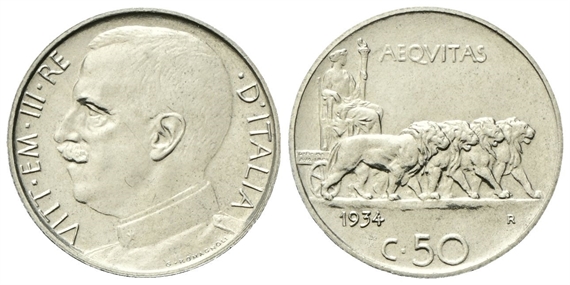Vittorio Emanuele III, 1900-1943. 50 Centesimi 1934 Roma, Leoni, bordo Rigato.