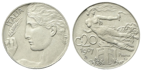 Vittorio Emanuele III, 1900-1943. 20 Centesimi 1907 PROVA Stabilimento Johnson Milano.