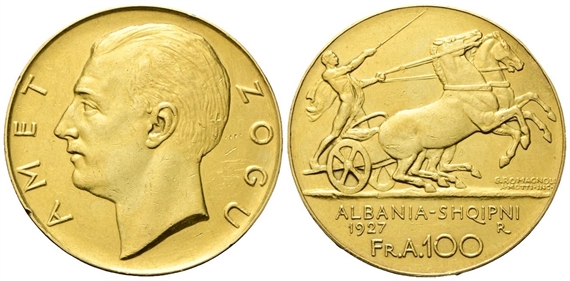 Re Zogu I, 1925-1939. 100 Franga Ari 1927, zecca di Roma.