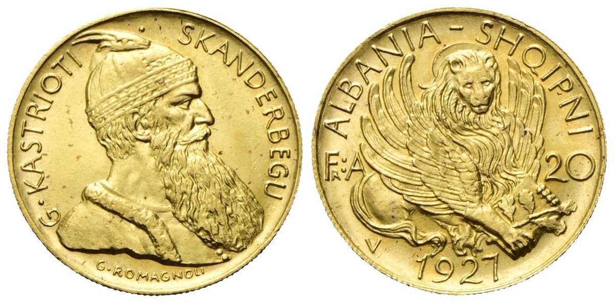 Re Zogu I, 1925-1939. 20 Franga Ari 1927, zecca di Vienna.