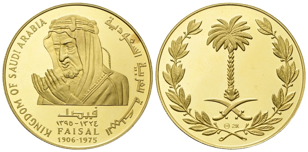 Dr. KINGDOM OF SAUDI ARABIA. Busto del re Faisal Bin Abdulaziz Al-Saud rivolto a s. in preghiera; sotto, FAISAL 1906-1975. Rv. Emblema dell'Arabia Saudita (due spade incrociate con una palma nello spazio sopra e tra le lame) all'interno di una corona; sotto le spade, marchio della zecca e finezza dell'oro.