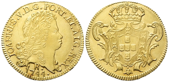 Dr. IOANNES V D G PORT ET ALG REX. Testa laureata a d.; sotto, R / 1744. Rv. Stemma coronato in cornice.