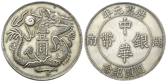 E’ una moneta commemorativa di fantasia del primo anno della fondazione dell’impero cinese, o Hongxian Monarchy. Il presidente cinese Yuan Shikai da fine 1915 a inizio 1916 tentò di ripristinare la monarchia in Cina, con sé stesso come imperatore, a Hunan. Il drago del dritto presenta il classico disegno imperiale, mentre la legenda fa riferimento al quinto anno della Repubblica di Cina, cinque anni dopo il rovesciamento della dinastia Qing.
