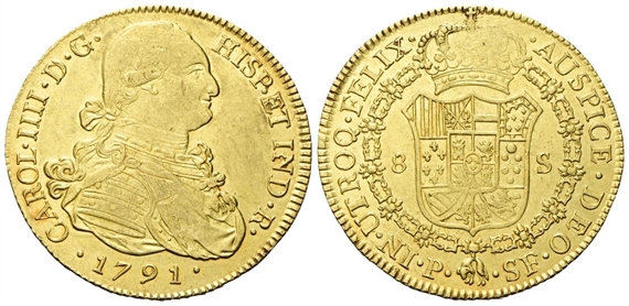 Carlo IV, 1788-1808. 8 Escudos 1791 NI P-SF, zecca di Popayan.