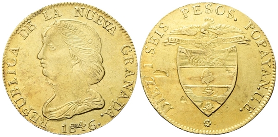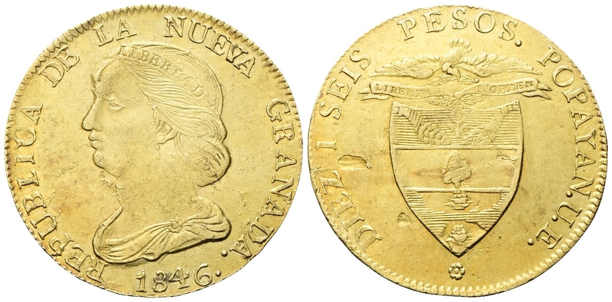 Dr. REPUBLICA DE LA NUEVA GRANADA•1846•. Busto drappeggiato di Liberty a s., con fascia. Rv. DIEZ I SEIS PESOS•POPYAN•U•E•. Stemma della Nuova Granada.