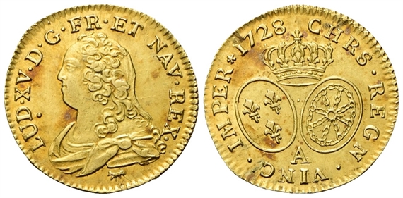 Luigi XV di Borbone (re di Francia), 1715-1774. Luigi d’oro aux lunettes 1728 A, zecca di Parigi.