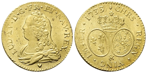Dr. LUD XV D G FR - ET NAV REX. Busto drappeggiato a s. Rv. CHRS REGN VINC IMPER 1733. Stemmi di Francia e Navarra affiancati e coronati.