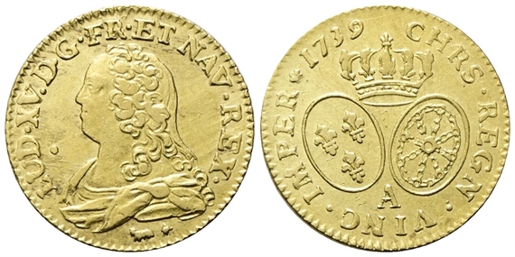 Luigi XV di Borbone, 1715-1774. Louis d’or aux lunettes 1739, zecca di Parigi.