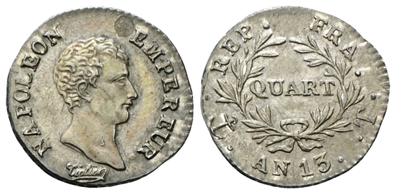 Napoleone I Imperatore, 1804-1814 e 1815. Quarto di Franco an. 13 T, zecca di Nantes.