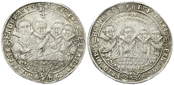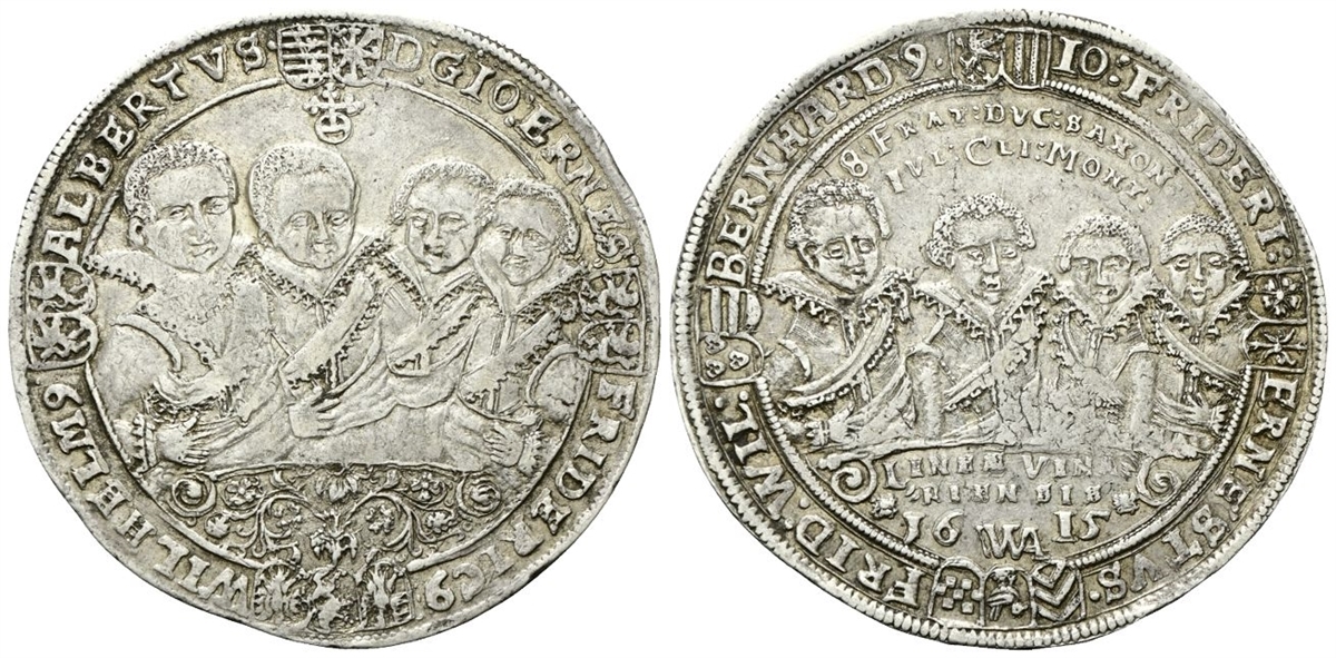Dr. D :GIO :ERNES: (scudo) FRIDERIC9(scudo) WILHELM 9 (scudo) ALBERTVS•. Quattro busti. Rv. IO: FRIDERI: - ERNESTVS• (scudo) FRID: WIL: (scudo) BERNHARD 9• / 8 FRAT: DVC: SAXON: / IVL: CLI :MONT:. Quattro busti; sotto, LINAE VINA / RIENSIS / 16 - WA - 15.