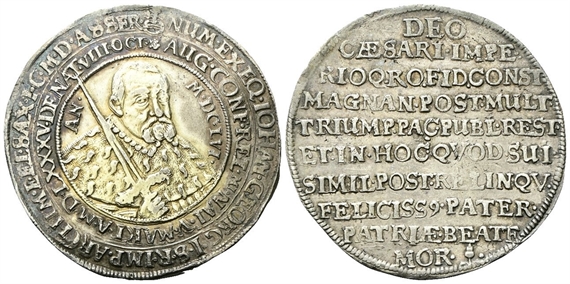 Dr. (globo crucigero) NUM •EXEQ •IOHAN •GEORG• I• S• R• IMP• ARCHIM •E •EL• SAX• I• C• M• D• ASSER / ✿AUG •CONF• REL• NAT• V• MART •A• MDLXXXV• DENAT •VIII •OCT•. Busto di scorcio verso d., regge spada che appoggia sulla spalla d.; ai lati, AN - MDCLVI. Rv. DEO / CAESARI IMPE/ RIOQ RO FID CONST / MAGNAN POST MULT / TRIUMP PAC PUBL REST / ET IN HOC QVOD SUI / SIMIL POST RELIQV / FELICISS9 PATER / PATRIAE BEATE / MOR (ghianda). Iscrizione disposta su dieci righe.