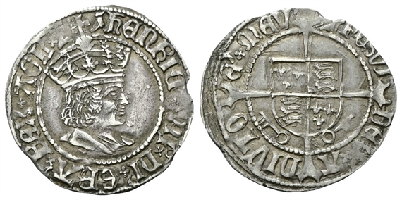 Dr. +(merlo) hENRIC +VII’ + DI’+ GRA’+ REX+AGL’+ Z. Busto coronato e drappeggiato a s. Rv. (merlo) POSVI - DEV’ + A - DIVTO - E' + MEV'. Scudo inquartato con le armi dell’Inghilterra e della Francia; sotto, due chiavi.