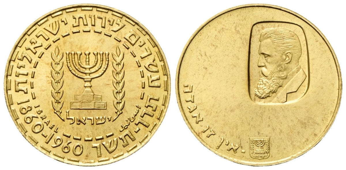 Dr. Menorah fiancheggiata da due rami di ulivo. Rv. Ritratto di T. Herzl entro rettangolo incuso; sotto, Menorah fiancheggiata da rami di ulivo.