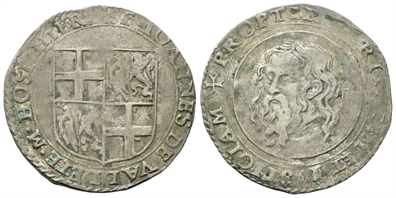 Dr. + F IOANNES DE VALLETE M HOSP HIER. Stemma inquartato con le insegne del Gran Maestro (girfalco e leone) e quelle dell’ordine. Rv. +PROPTER VERITAEM ET IVSTICIAM. Testa di San Giovanni.