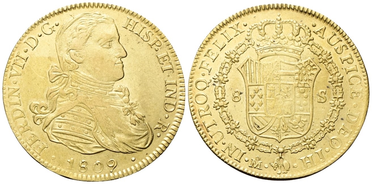 Ferdinando VII di Spagna, 1808-1833. 8 Escudos 1809 Mo - HJ, Città del Messico.