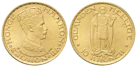 Haakon VII, 1905-1957. 10 Kroner 1910, zecca di Kongsberg.