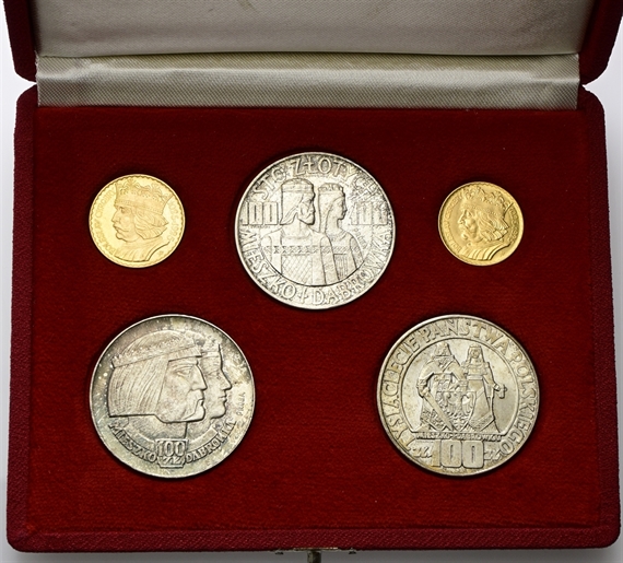 Repubblica Popolare, 1945-1989. Serie di 5 valori così composta: 20 e 10 Zlotych 1925 (Au); 100 Zlotych 1966 Prova (x2), 100 Zlotych 1966.