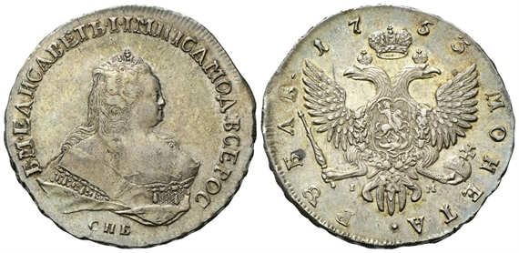 Elisabetta II, Imperatrice 1741-1761. Rublo 1753, zecca di San Pietroburgo.