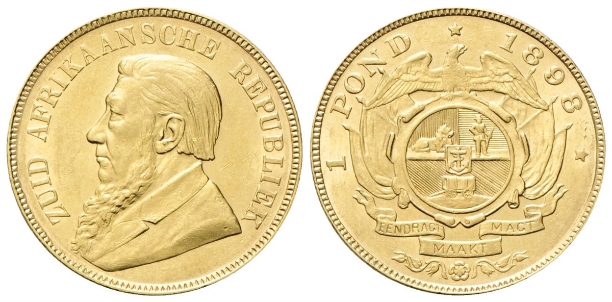 Dr. Busto di Paul Kruger barbuto a s. Rv. Stemma nazionale; sopra, aquila.
