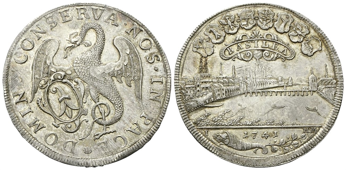 Dr. DOMINE CONSERVA NOS IN PACE. Basilisco alato con le armi di Basilea. Rv. BASILEA (in un cartiglio decorativo sotto otto stemmi). Veduta della città; in esergo, 1741 / cornucopia.
