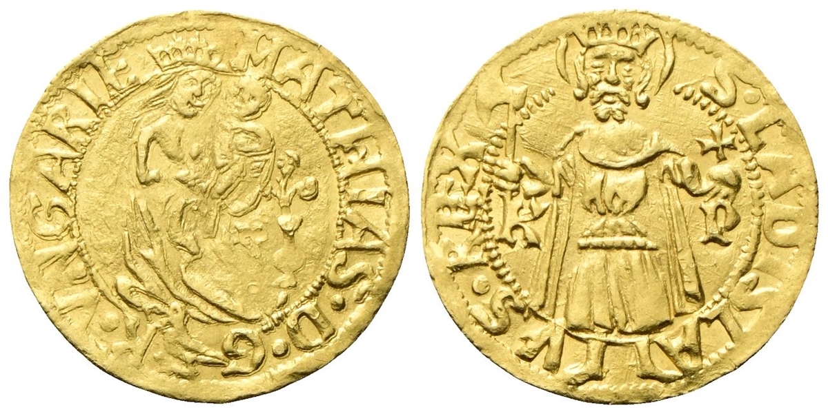 Dr. MAThIAS •D • G (corvo) R• VNGARIE. Madonna in trono. Rv. S• LADISLA - VS• REX. San Ladislao con ascia da battaglia e globo crucigero; ai lati, K - P.