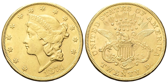 Federazione. 20 Dollari 1874 CC, Liberty Head, Double Eagle with motto, zecca di Carson City.