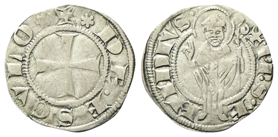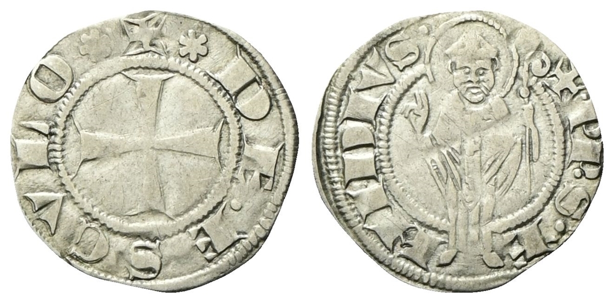 Dr.+ ✶ DE• ESCVLO✶. Croce patente. Rv. +•P P• S• E - MIDIVS•. Il Sante frontale in atto di benedire.