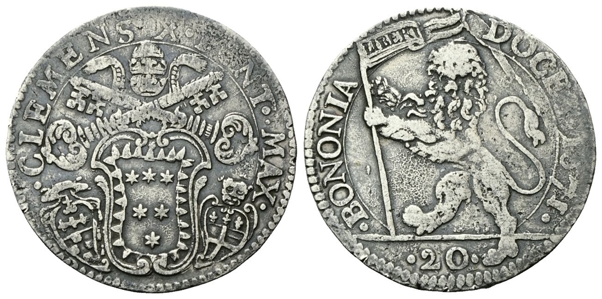 Dr. •CLEMENS X •PONT• MAX•. Stemma sormontato da triregno e chiavi decussate tra gli stemmi Pallavicini e della città. Rv. •BONONIA - DOCET• 1671•. Leone vessillifero rampante verso s.