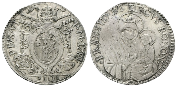 Dr. •PIVS •VI• - •P •M •1781•. Stemma sormontato da triregno e chiavi decussate; ai lati, armette Boncompagni e della città. Rv. •PRAESID •ET• DECVS •BONON•. Mezza figura della Madonna di S. Luca con il Bambino, entrambi nimbati.
