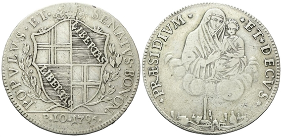 Dr. POPVLVS• ET• - •SENATVS• BONON•. Stemma sormontato da testa leonina tra due rami di lauro; in esergo, 1796. Rv. ✶PRAESIDIVM✶ - ✶ET✶ DECVS✶. La B.V. con il Figlio sulle nubi; sotto, veduta della città.