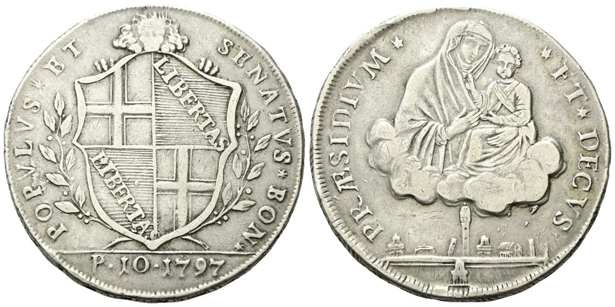 Dr. POPVLVS✶ ET - SENATVS✶ BON✶. Stemma sormontato da testa leonina tra due rami di lauro; in esergo, 1797. Rv. PRAESIDIVM✶ - ✶ET✶ DECVS. La B.V. con il Figlio sulle nubi; sotto, veduta della città.