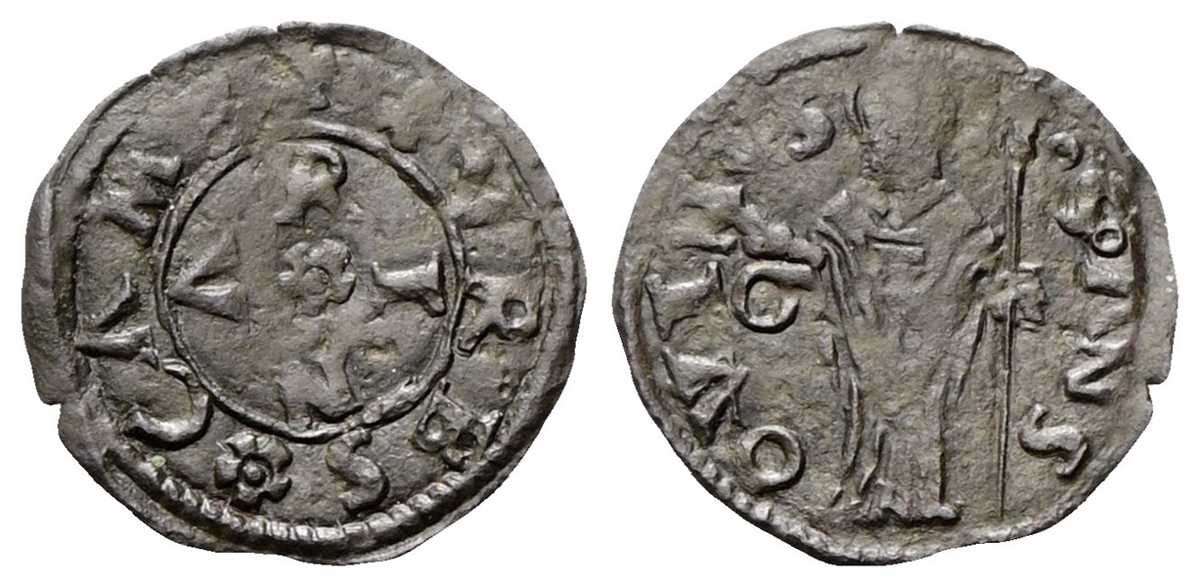 Dr. ✿VRBS ✿CAME✿. Le lettere R I N A disposte attorno a rosetta. Rv. •S • ANS - OVINVS. Il Santo, nimbato e mitrato, benedicente.