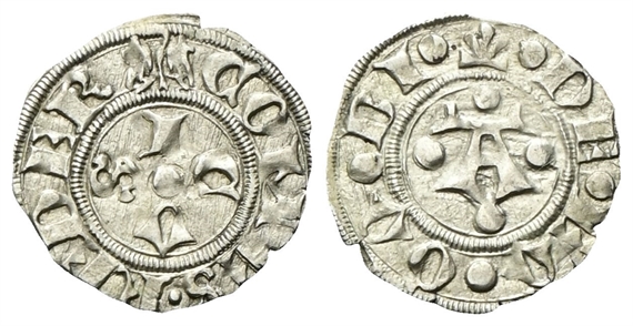 Dr. (Aquiletta) COMES•FEDER. Le lettere I C V S attorno a globetto. Rv. (monte) •DE•EV•GV•BI•. Grande A accantonata da quattro globetti.