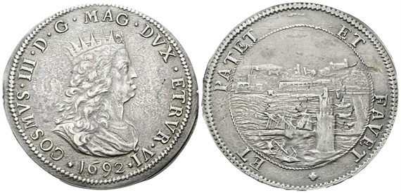 Dr. ✤COSMVS• III •D •G• MAG• DVX• ETRVR • VI✤. Busto radiato, drappeggiato e corazzato a d.; sotto, nel giro, 1692. Rv. ✤ET - PATET - ET - FAVET. Veduta del porto di Livorno con il faro in primo piano.
