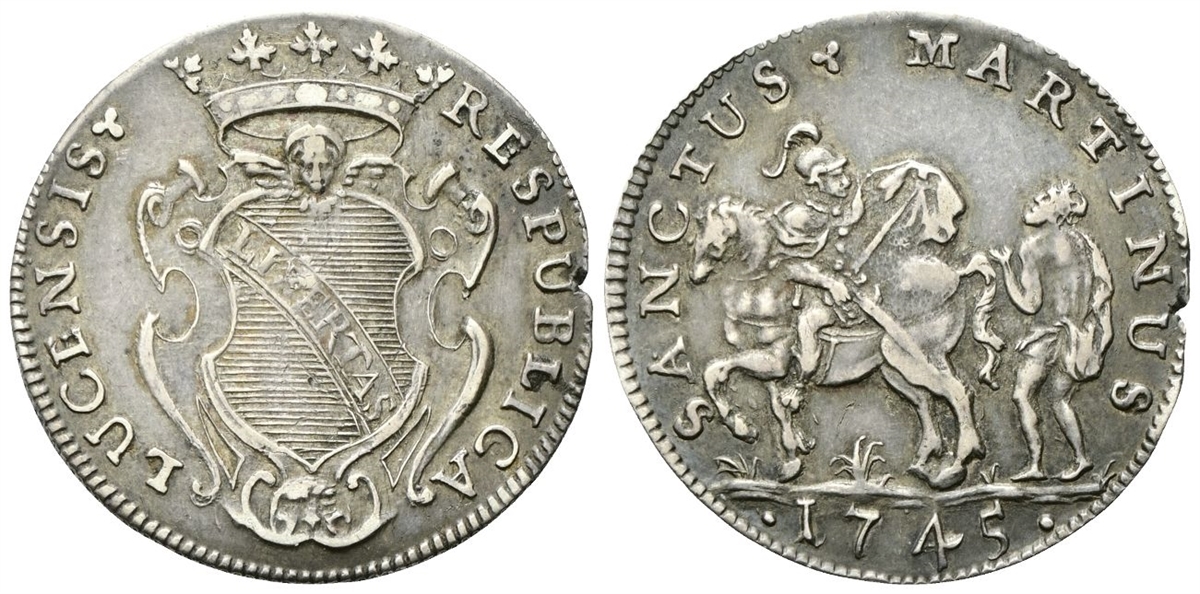 Dr. RESPVBLICA - LVCENSIS (trifoglio). Scudo semiovale incavato ai lati, con banda iscritta LIBERTAS, coronato da cherubino. Rv. SANTVS (trifoglio) MARTINUS. Il Santo a cavallo taglia il mantello da donare al mendicante; in esergo, •1745•.