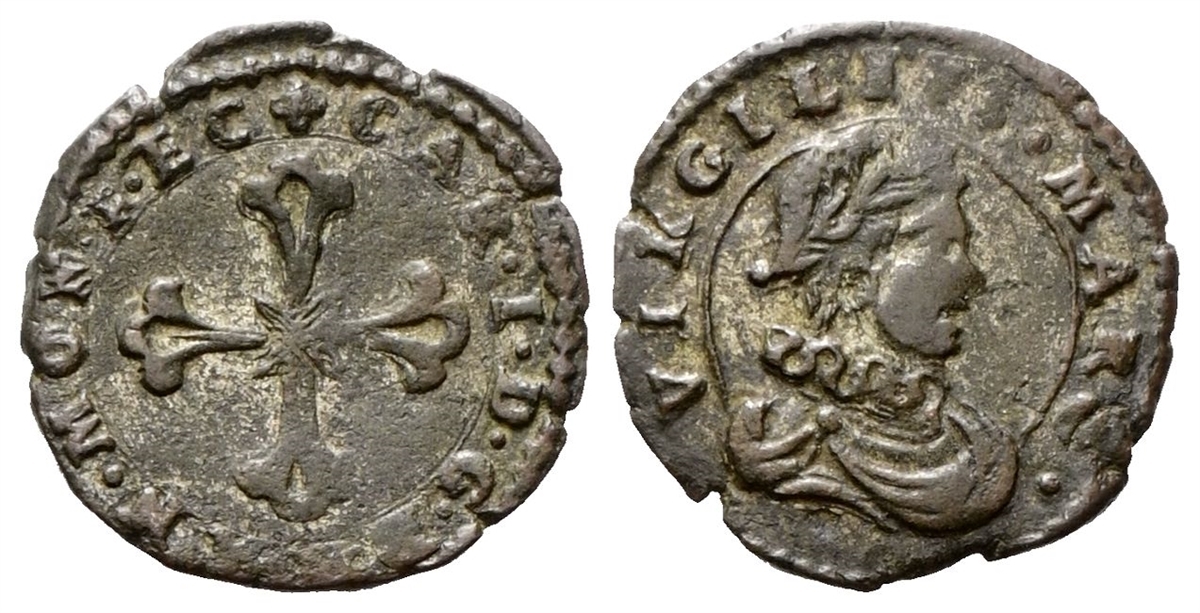 Dr. ✤CAR•I•D•G•D•MAN• MON •F •EC. Croce trilobata. Rv. VIRGILIVS• MARO•. Busto di Virgiliio laureato a d., con colletto alla spagnola.