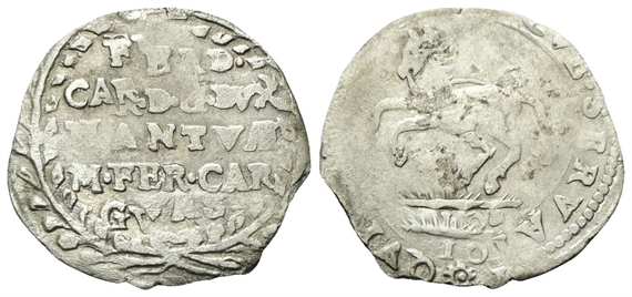 Dr. FERD• / CAR• D• G• DVX / MANTVAE / M• FER• CAR / GVAS[T]. Iscrizione disposta su cinque righe. Rv. QVI LEGES IVRAQVE SERVAT. Cavallo verso s.