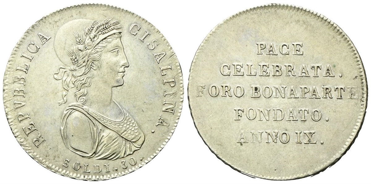 Dr. REPVBLICA - CISALPINA•. Busto muliebre a d., galeato e coronato di spighe. Rv. PACE / CELEBRATA• / FORO BONAPARTE / FONDATO• / ANNO IX•. Iscrizione disposta su cinque righe.