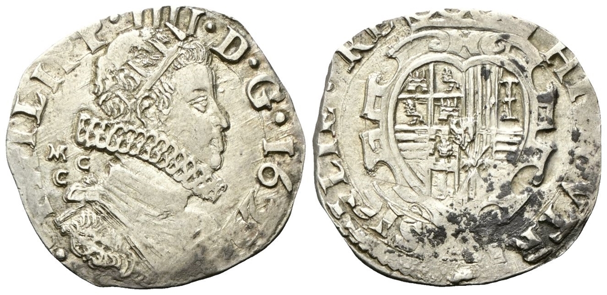 Dr. PHILIPP •IIII •D• G •1622. Busto radiato a d., con alto collare; dietro il collo, MC/C. Rv. HISP VTRIV SICILIE RE. Stemma coronato, in cartella a forma di cuore in cartocci.