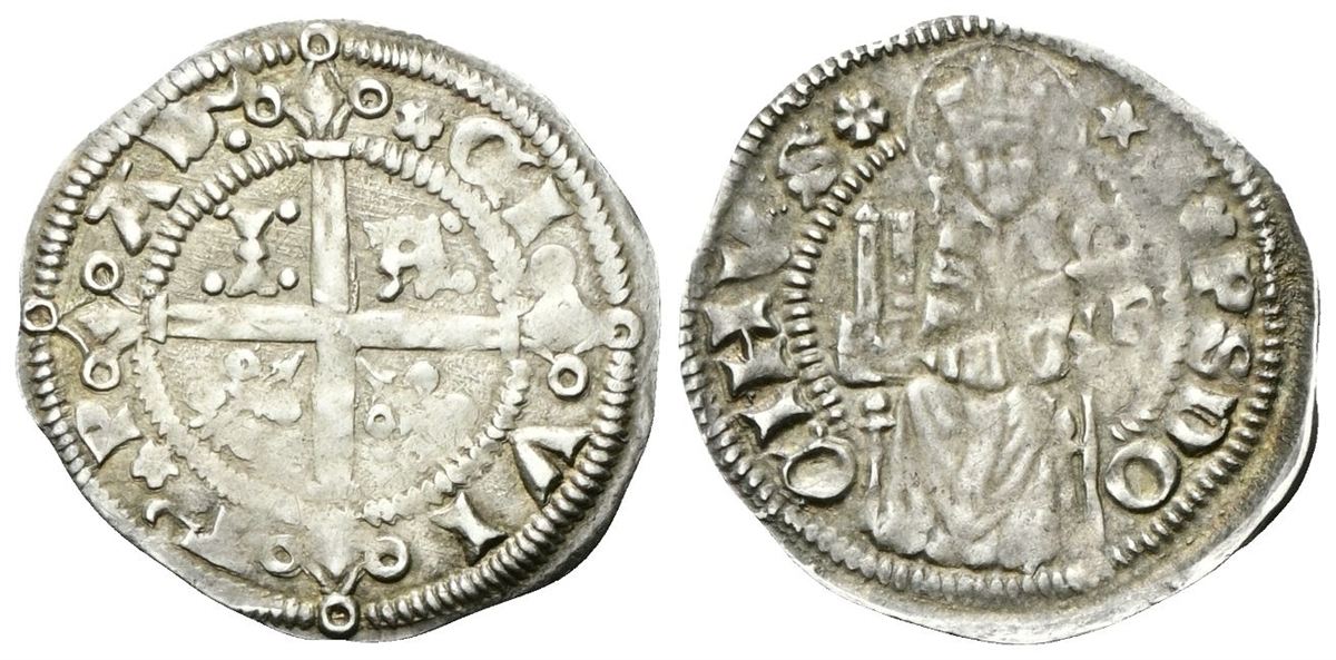 Dr. ✿C I - VI - T ✿ - P - AD’. Croce filettata e ornata alle estremità. Rv. ★S✿PSDO - CIHVS✿. Il Santo nimbato e mitrato, seduto di prospetto, tiene nella d. un edificio turrito e nella s. il pastorale; a d., P.