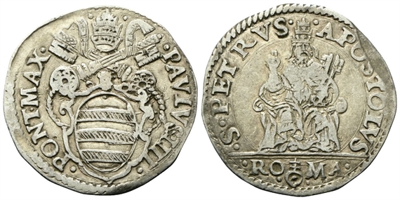 Dr. •PAVLVS• IIII• - •PONT• MAX•. Stemma sormontato da triregno e chiavi decussate con cordoni. Rv. •S• PETRVS• - •APOSTOLVS. S. Pietro, seduto in trono e frontale, con triregno e chiavi, solleva la mano d. per benedire; in esergo, •RO - MA•.