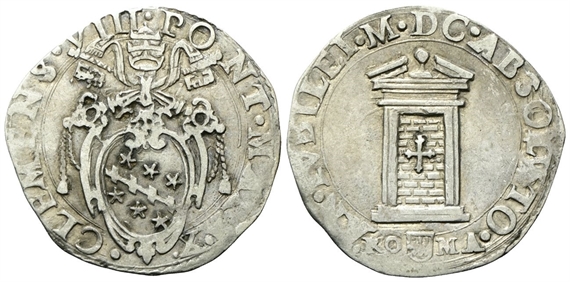 Dr. •CLEMENS•VIII• PO - NT• MAX• A• X• . Stemma sormontato da triregno e chiavi decussate. Rv. AN• IVBILEI• M• D C• ABSOLVTO•. Porta chiusa; nel vano, croce; •RO (segno di zecca) MA•.