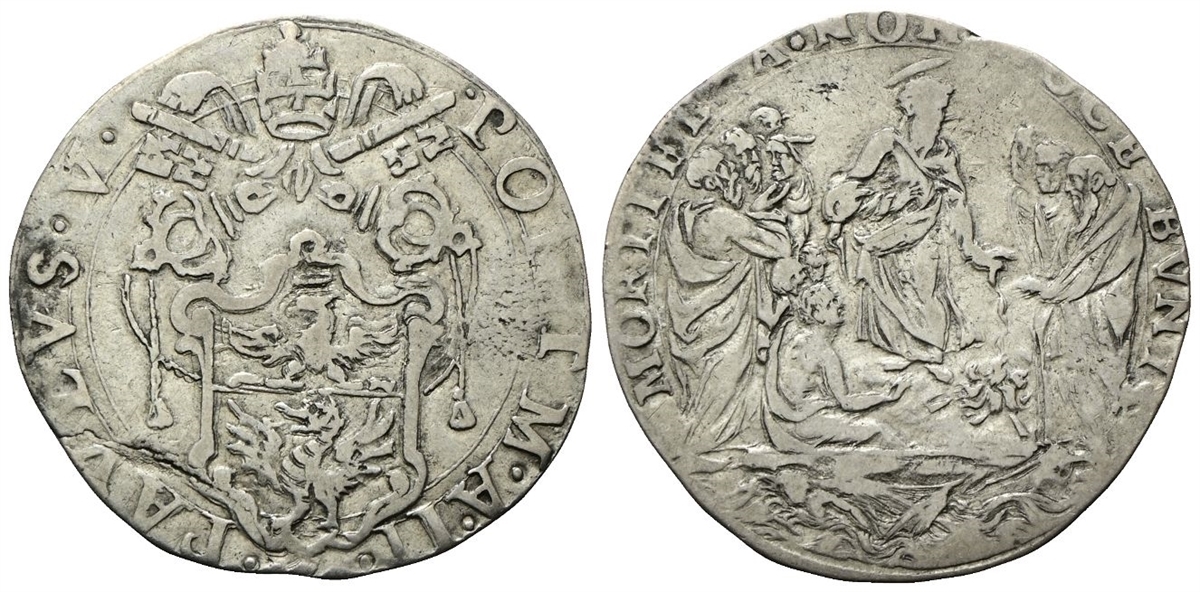Dr. •PAVLVS• V• - •PONT M• A •II•. Stemma a targa sormontato da triregno e chiavi decussate. Rv. MORTIFERA• NON• NOCEBVNT (stemma Primi). Il miracolo delle serpi.