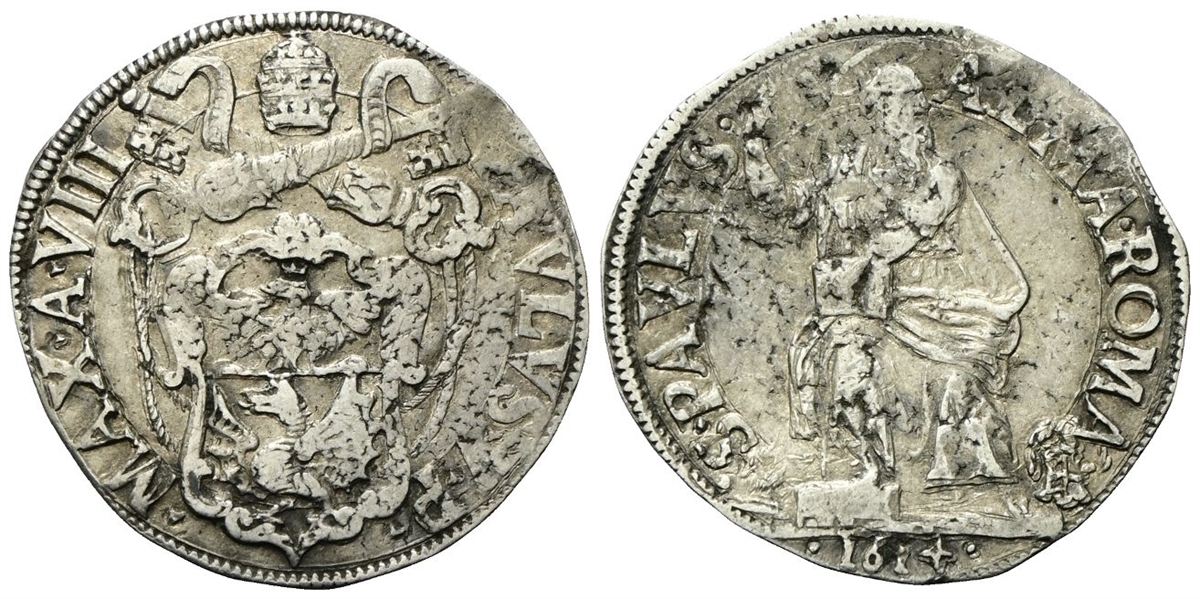 Dr. PAVLVS V▾P▾ - ▾MAX▾A▾VIII. Stemma a targa sormontato da triregno e chiavi decussate. Rv. S• PAVLVS• - ALMA• ROMA (stemma Primi). San Paolo seduto verso d.; tiene libro aperto e spada; in esergo, 1614.