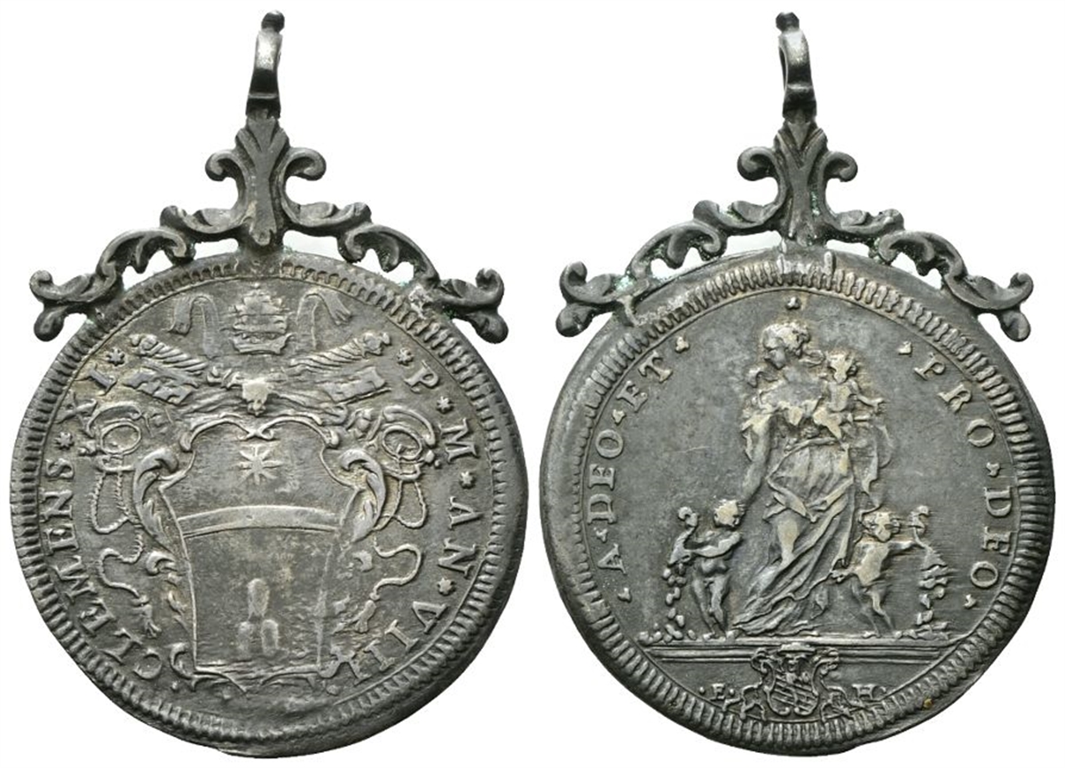 Dr. •CLEMENS✶ XI✶ - ✶P✶ M✶ AN✶ VIII•. Stemma oblungo sormontato da triregno e chiavi decussate. Rv.▴A▴ DEO▴ ET▴ -▴-▴ PRO▴ DEO▴. Donna con in braccio un bimbo, tra due fanciulli che versano monete da due cornucopie (allegoria della Carità); in esergo, E (armetta d’Aste) H.