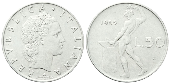 Repubblica Italiana, dal 1946. 50 Lire 1954 Vulcano.