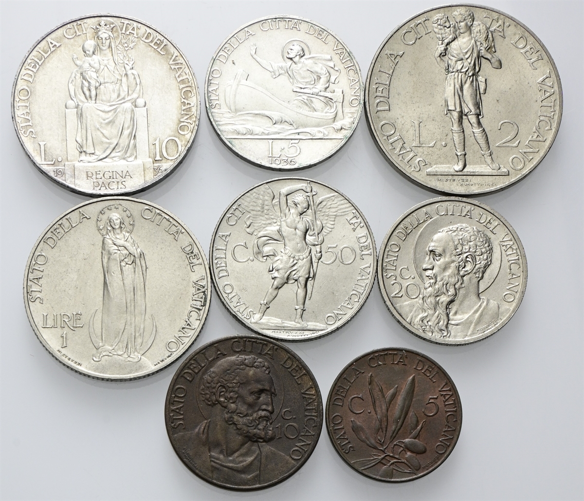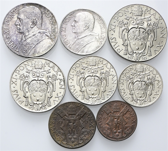 Pio XI (Achille Ratti), 1929-1939. Serie di 8 valori 1936 a. XV, comprendente 10 e 5 Lire (Ag), 2 e 1 Lira, 50 e 20 Centesimi (Ni), 10 e 5 Centesimi (Cu).