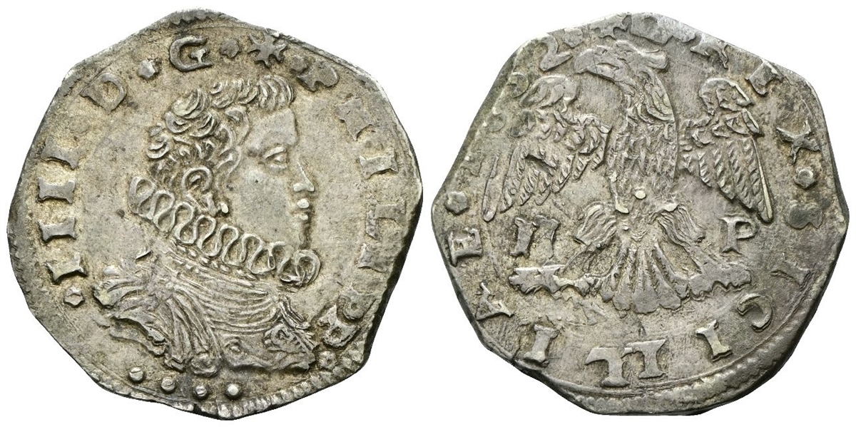 Dr. +★PHILIPP★ - ★ III★ D★G.★. Busto Busto corazzato, coronato, con colletto alla spagnola, a d.; sotto, quattro globetti. Rv. ★REX★ SICILIAE★ 1652. Aquila coronata ad ali aperte, volta a s.; sotto le ali, IL - V.